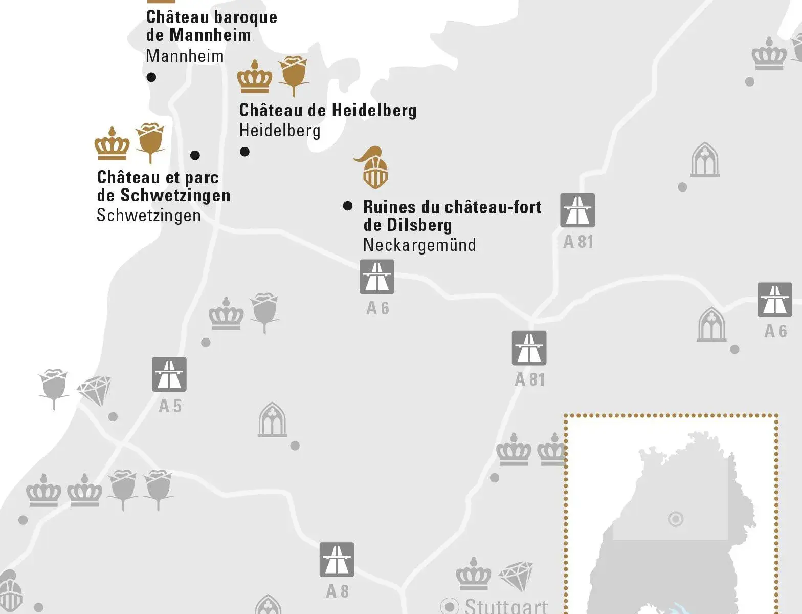 Le Château de Heidelberg est le plus connu de tous les châteaux – mais on ne peut ignorer la résidence ultérieure, le Château Baroque de Mannheim et le Château et Schwetzingen, la résidence d'été avec son parc célèbre. La région métropolitaine plonge ses racines historiques exactement ici!