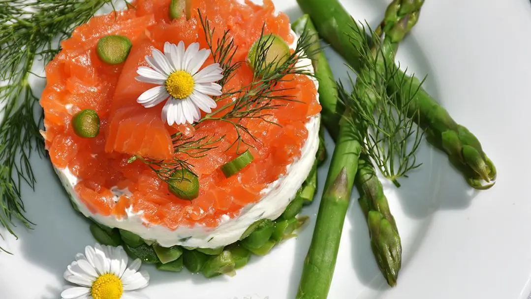 Mit ein paar Spargelspitzen, Dill und gewaschenen Gänseblümchen, am besten aus dem eigenen Garten, garnieren.