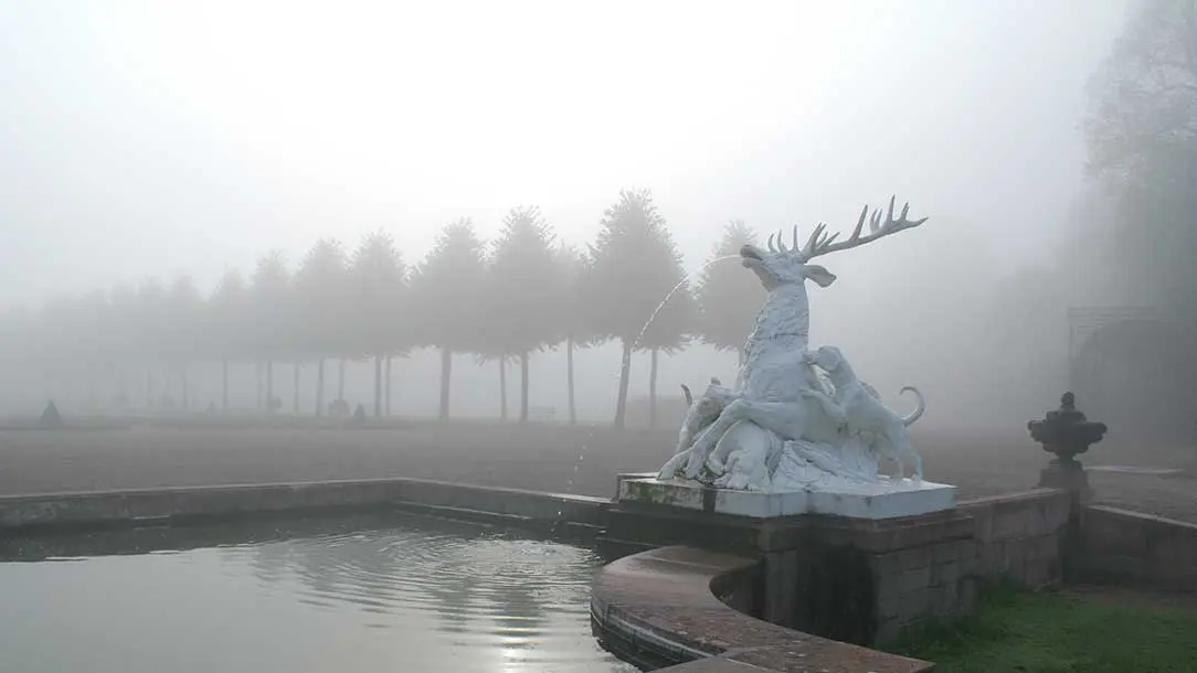 Schlossgarten Schwetzingen mit Hirschgruppe im Nebel.