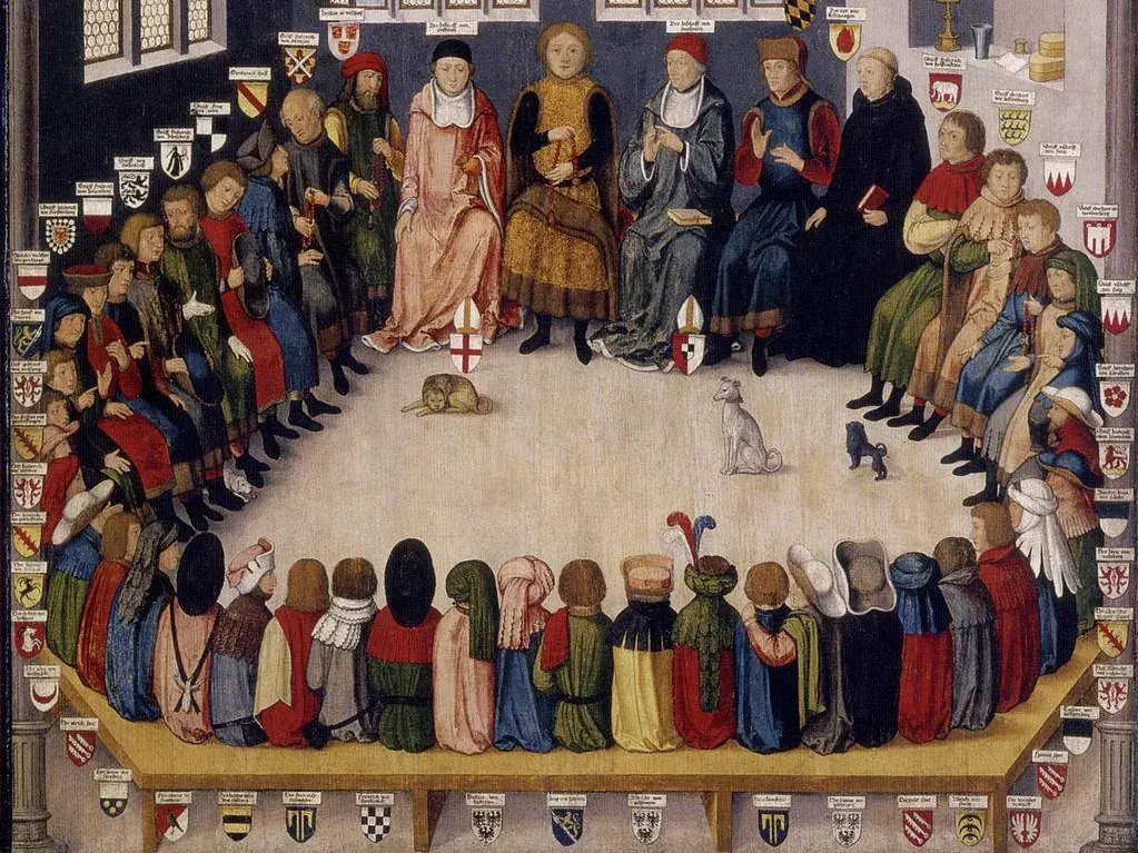 Ratssitzung des Grafen Eberhard des Milden, Ölbild, Kopie um 1540, Vorbild um 1440