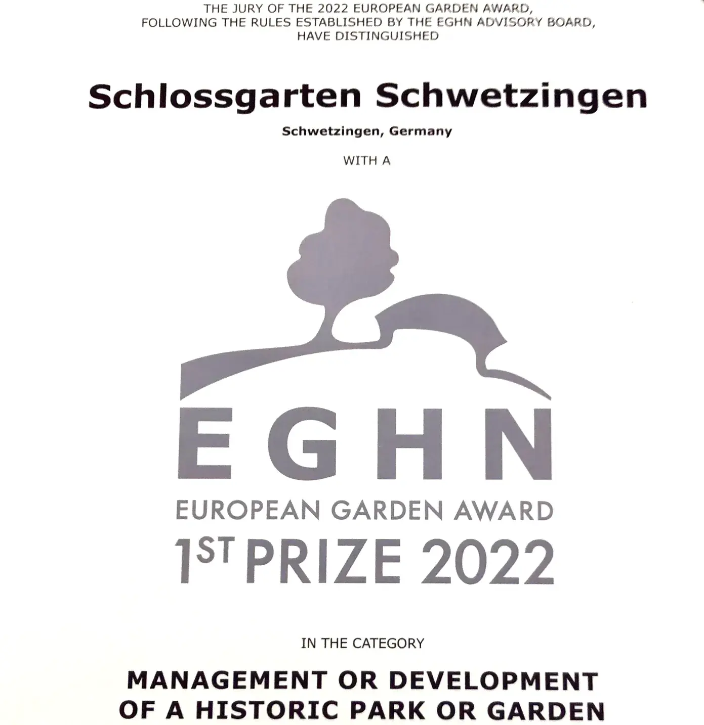 Als einziger deutscher Garten hat Schloss und Schlossgarten Schwetzingen im Sommer 2022 den ersten Preis des Europäischen Gartenpreises erhalten. Vergeben wird dieser Preis vom Europäischen Gartennetzwerk EGNH und der Stiftung Schloss Dyck in Jüchen.