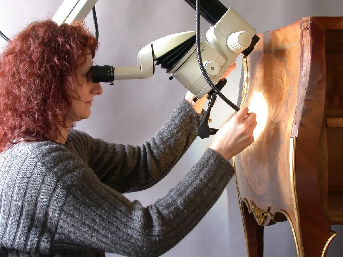 Eine Restauratorin betrachtet ein Möbelstück am Technoskop