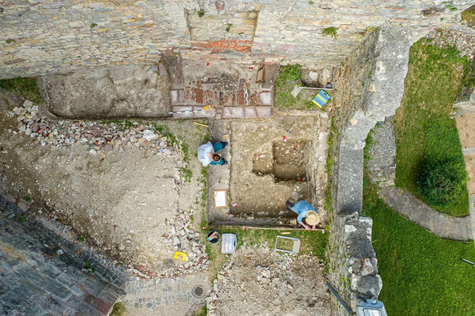 Die Ehrenamtlichen arbeiteten jeweils bis zu zwei Wochen am Stück an den acht über die Anlage verteilten Grabungsschnitten. Dafür erhielten sie eine archäologische Grundausbildung und erlernten Methoden der Ausgrabung, Vermessung und Dokumentation. Wesentlich war das präzise Einzeichnen der Fundobjekte auf Millimeterpapier. Aber auch moderne digitale Technik kam zum Einsatz, um Befunde dreidimensional zu erfassen. Die schwer einsehbaren Bereiche zwischen den Mauern konnten per Drohnenflug erkundet werden.