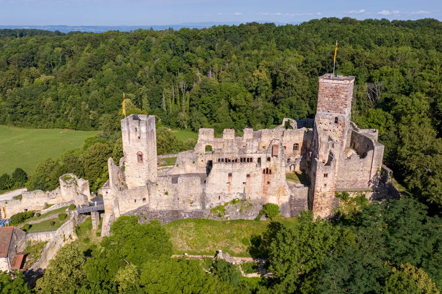 Luftbild der von Wald umgebenen oberen Burgruine Rötteln mit Türmen und Mauern