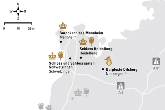 Schloss Heidelberg ist das bekannteste aller Schlösser – aber es ist nicht denkbar ohne die spätere Residenz, das Barockschloss Mannheim, und Schloss Schwetzingen, den Sommersitz mit dem berühmten Schlossgarten. Hier liegen die historischen Wurzeln der Metropolregion!